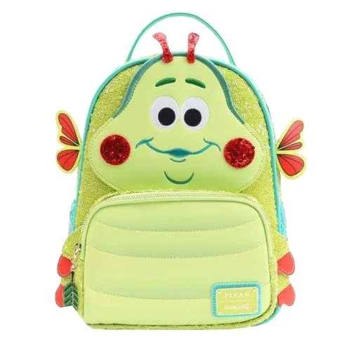 This backpack features Heimlich with his butterfly wings created in stunning applique! They stretch outside the backpack, which is covered in shiny sequins. The cleverly laid-out design depicts the accessory as Hemlich’s body, with his happy face placed above the front zipper compartment, which features embroidered linework to represent the scales of his belly. His arms peek out from the sides, while the compartment is accessible with a leaf-shaped enamel zipper charm.