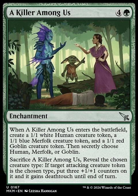 When A Killer Among Us enters the battlefield, create a 1/1 white Human creature token, a 1/1 blue Merfolk creature token, and a 1/1 red Goblin creature token. Then secretly choose Human, Merfolk, or Goblin.