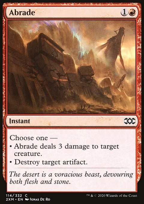 Choose one — • Abrade deals 3 damage to target creature. • Destroy target artifact.