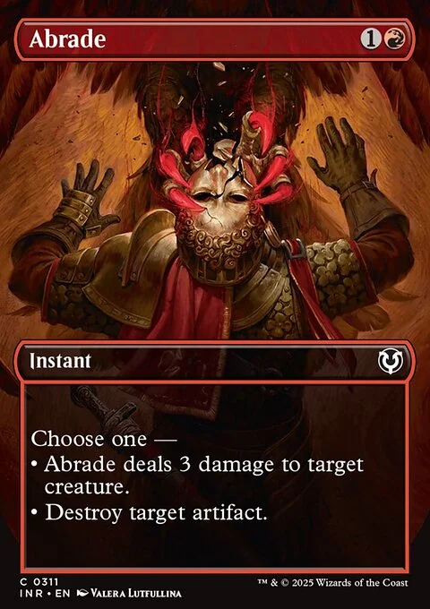Choose one — • Abrade deals 3 damage to target creature. • Destroy target artifact.
