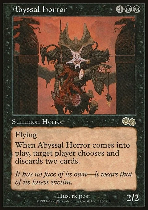 Flying, When Abyssal Horror comes into play, target player chooses and discards two cards.
