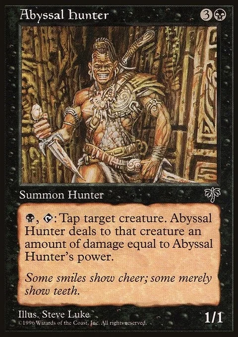B, T: Tap target creature. Abyssal Hunter deals to that creature an amount of damage equal to Abyssal Hunter’s power.