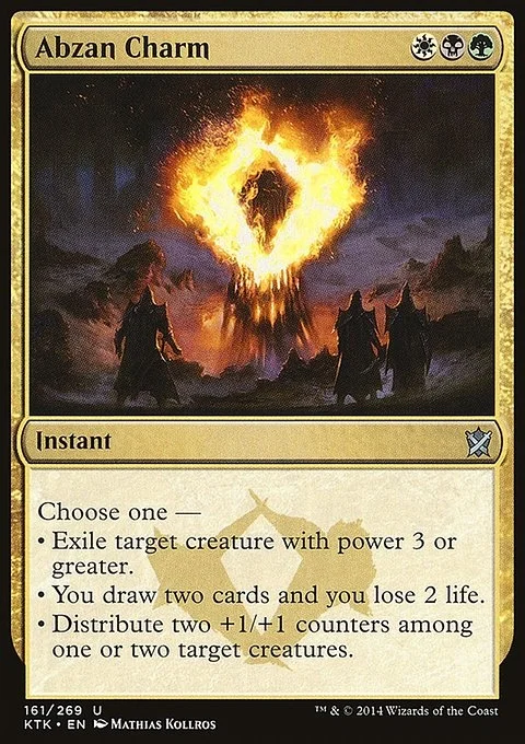 Choose one — • Exile target creature with power 3 or greater. • You draw two cards and you lose 2 life. • Distribute two +1/+1 counters among one or two target creatures.