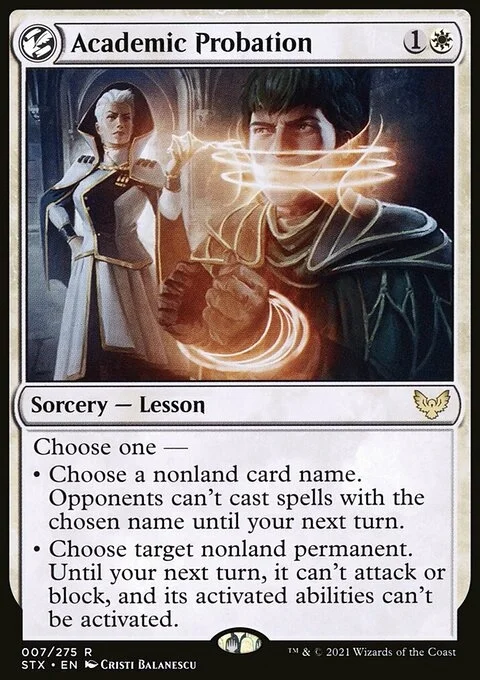 Choose one — • Choose a nonland card name. Opponents can't cast spells with the chosen name until your next turn. • Choose target nonland permanent. Until your next turn, it can't attack or block, and its activated abilities can't be activated.