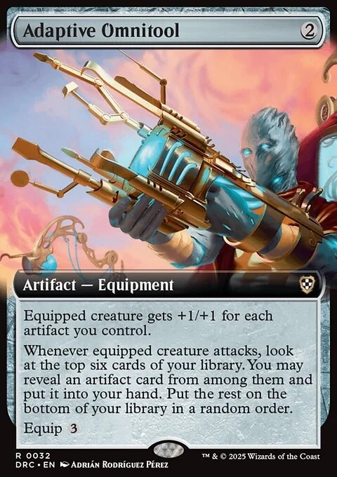 Equipped creature gets +1/+1 for each artifact you control. Whenever equipped creature attacks, look at the top six cards of your library. You may reveal an artifact card from among them and put it into your hand. Put the rest on the bottom of your library in a random order. Equip {3}