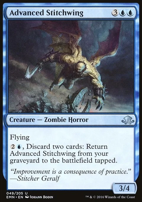 Flying {2}{U}, Discard two cards: Return Advanced Stitchwing from your graveyard to the battlefield tapped.