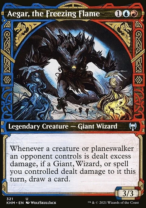 Whenever a creature or planeswalker an opponent controls is dealt excess damage, if a Giant, Wizard, or spell you controlled dealt damage to it this turn, draw a card.