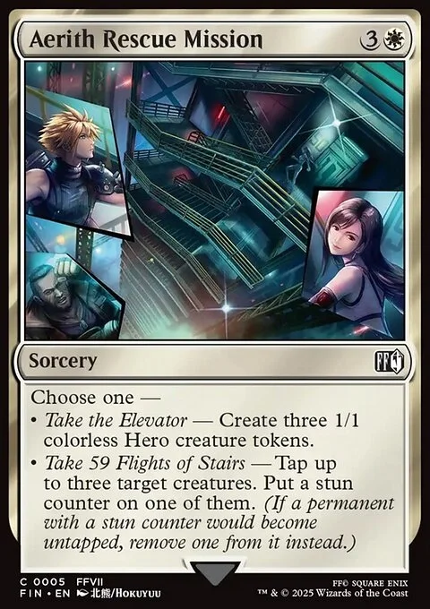 Choose one — • Take the Elevator — Create three 1/1 colorless Hero creature tokens. • Take 59 Flights of Stairs — Tap up to three target creatures. Put a stun counter on one of them. (If a permanent with a stun counter would become untapped, remove one from it instead.)