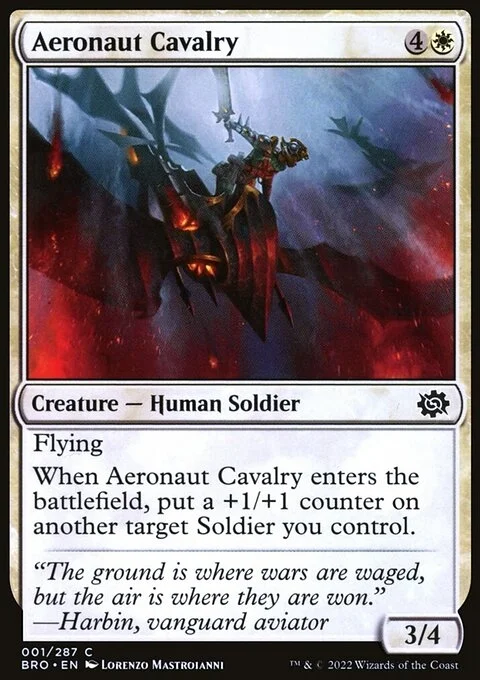 Flying When this creature enters, put a +1/+1 counter on another target Soldier you control.