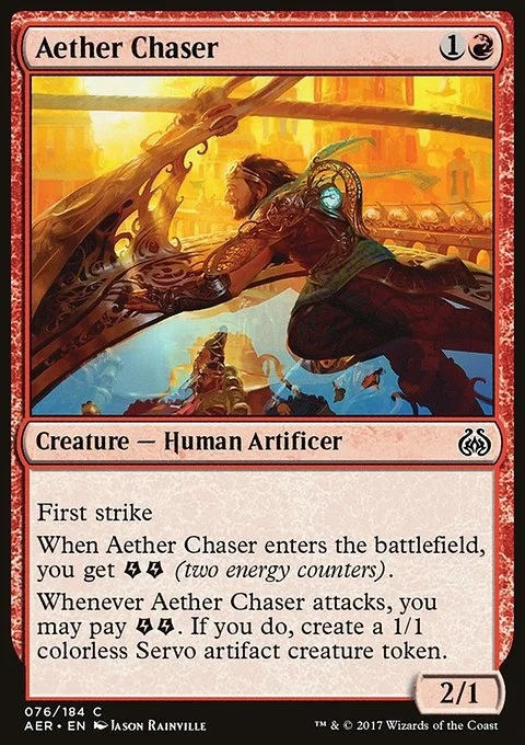 First strike When this creature enters, you get {E}{E} (two energy counters). Whenever this creature attacks, you may pay {E}{E}. If you do, create a 1/1 colorless Servo artifact creature token.