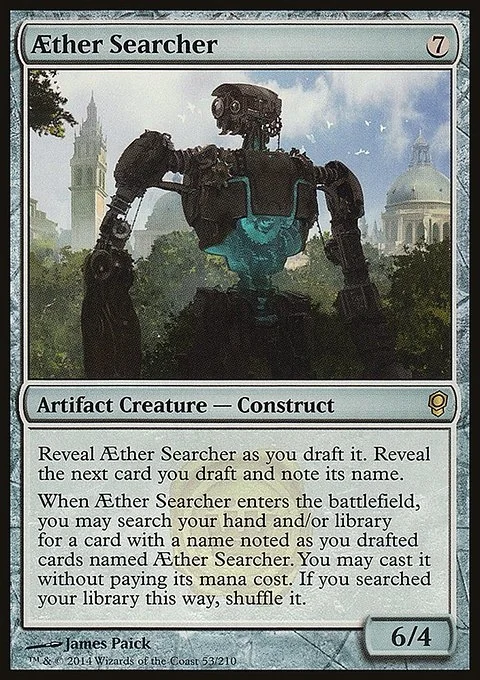 When Aether Searcher enters the battlefield, you may search your hand and/or library for a card with a name noted as you drafted cards named Aether Searcher. You may cast it without paying its mana cost. If you searched your library this way, shuffle it.