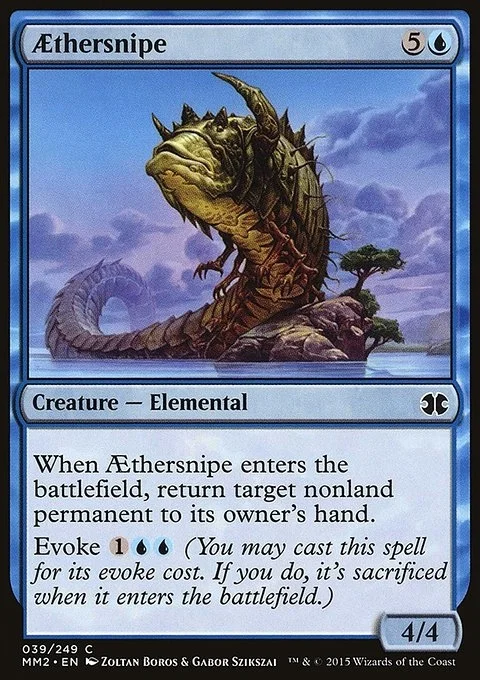 When Aethersnipe enters the battlefield, return target nonland permanent to its owner's hand. Evoke {1}{U}{U} (You may cast this spell for its evoke cost. If you do, it's sacrificed when it enters the battlefield.)