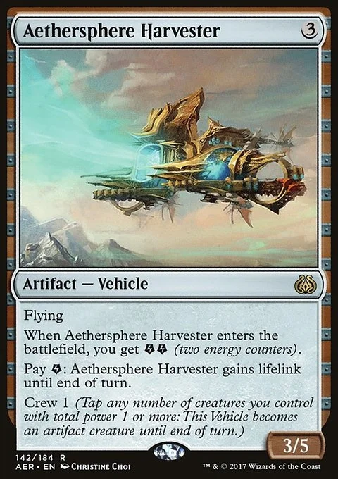 Flying When Aethersphere Harvester enters the battlefield, you get {E}{E} (two energy counters). Pay {E}: Aethersphere Harvester gains lifelink until end of turn. Crew 1 (Tap any number of creatures you control with total power 1 or more: This Vehicle becomes an artifact creature until end of turn.)