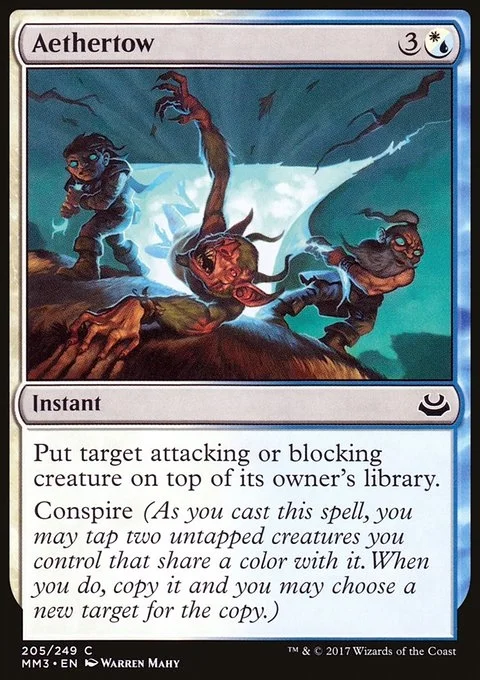 Put target attacking or blocking creature on top of its owner's library. Conspire (As you cast this spell, you may tap two untapped creatures you control that share a color with it. When you do, copy it and you may choose a new target for the copy.)