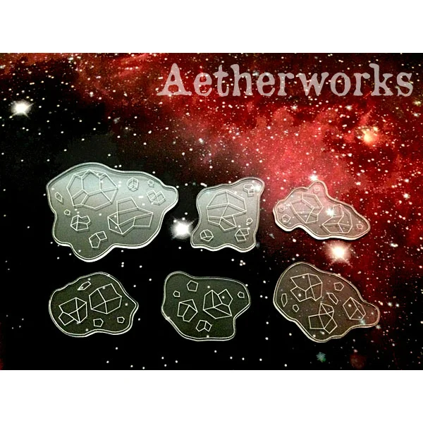 Templates with some retro asteroid designs on them, ideal for spaceship games such as X-Wing.