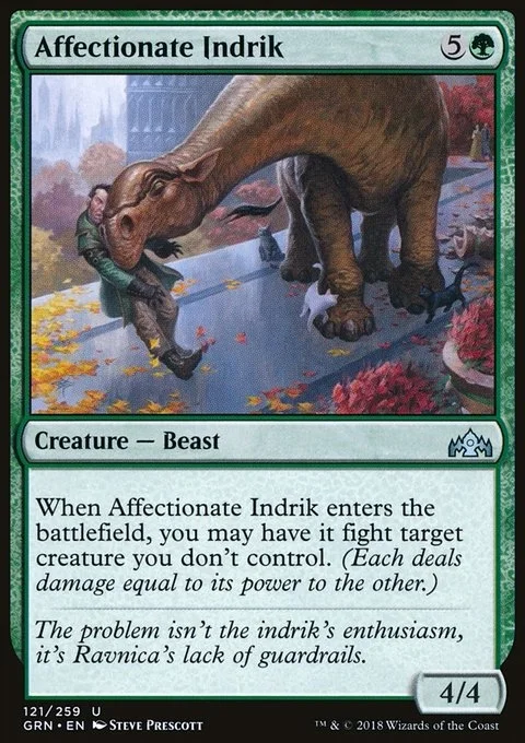 When Affectionate Indrik enters the battlefield, you may have it fight target creature you don't control. (Each deals damage equal to its power to the other.)