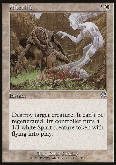 Destroy target creature. It can’t be regenerated. Its controller puts a 1/1 white Spirit creature token with flying into play.