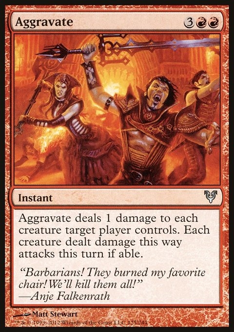 Aggravate deals 1 damage to each creature target player controls. Each creature dealt damage this way attacks this turn if able.