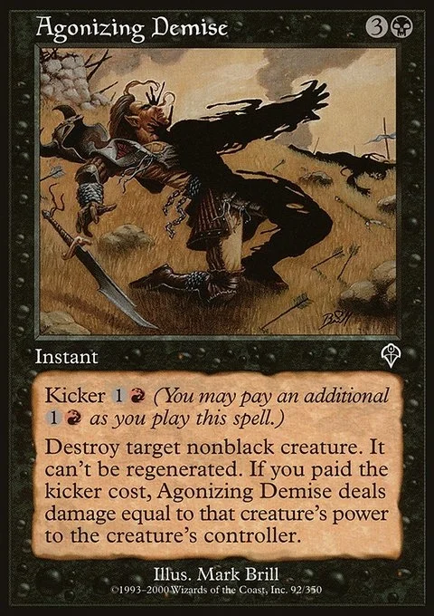 Kicker {1}{R} (You may pay an additional {1}{R} as you cast this spell.) Destroy target nonblack creature. It can't be regenerated. If this spell was kicked, Agonizing Demise deals damage equal to that creature's power to the creature's controller.