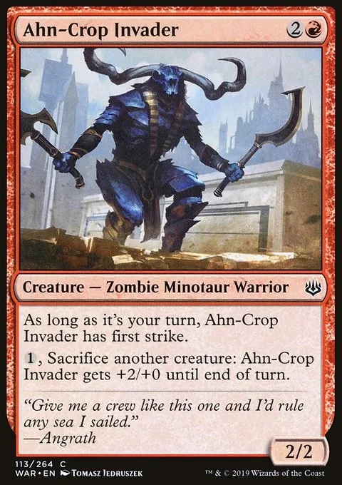 During your turn, this creature has first strike. {1}, Sacrifice another creature: This creature gets +2/+0 until end of turn.