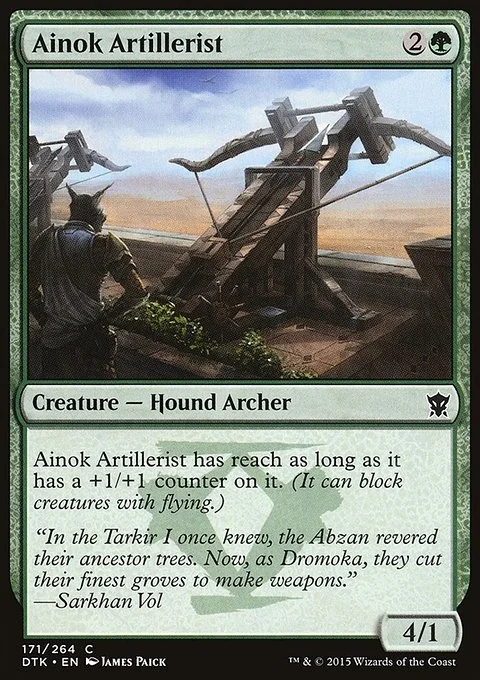 Ainok Artillerist has reach as long as it has a +1/+1 counter on it. (It can block creatures with flying.)