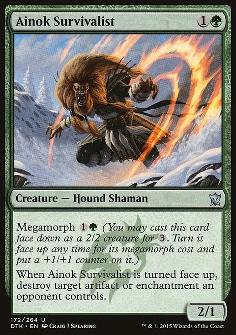 Megamorph {1}{G} (You may cast this card face down as a 2/2 creature for {3}. Turn it face up any time for its megamorph cost and put a +1/+1 counter on it.) When Ainok Survivalist is turned face up, destroy target artifact or enchantment an opponent controls.