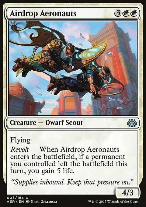 Flying Revolt — When Airdrop Aeronauts enters the battlefield, if a permanent you controlled left the battlefield this turn, you gain 5 life.