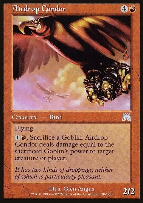 Flying {1}{R}, Sacrifice a Goblin creature: Airdrop Condor deals damage equal to the sacrificed creature's power to any target.
