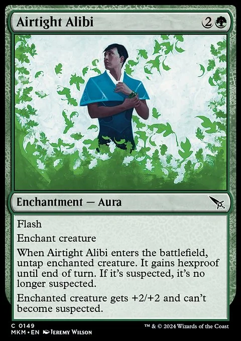 Flash Enchant creature When this Aura enters, untap enchanted creature. It gains hexproof until end of turn. If it's suspected, it's no longer suspected. Enchanted creature gets +2/+2 and can't become suspected.