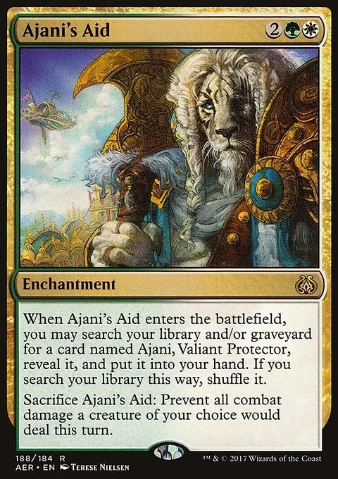 When Ajani's Aid enters the battlefield, you may search your library and/or graveyard for a card named Ajani, Valiant Protector, reveal it, and put it into your hand. If you search your library this way, shuffle.
