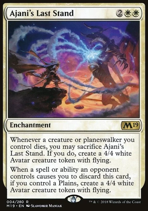 Whenever a creature or planeswalker you control dies, you may sacrifice Ajani's Last Stand. If you do, create a 4/4 white Avatar creature token with flying.