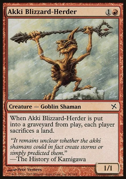 When Akki Blizzard-Herder dies, each player sacrifices a land.