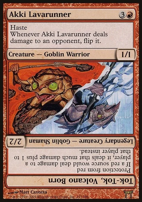 Akki Lavarunner Haste Whenever Akki Lavarunner deals damage to an opponent, flip it. Tok-Tok, Volcano Born Protection from red If a red source would deal damage to a player, it deals that much damage plus 1 to that player instead.