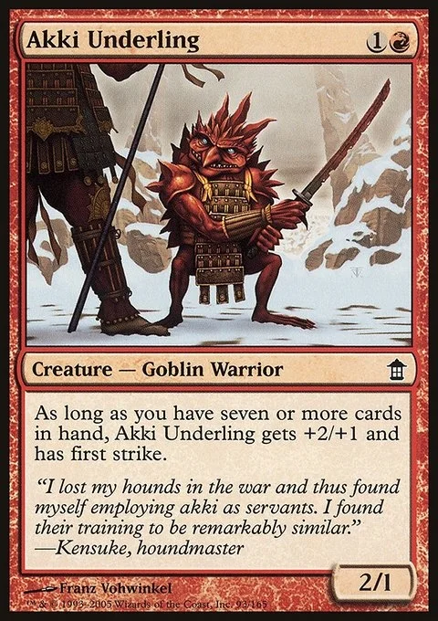 As long as you have seven or more cards in hand, Akki Underling gets +2/+1 and has first strike.