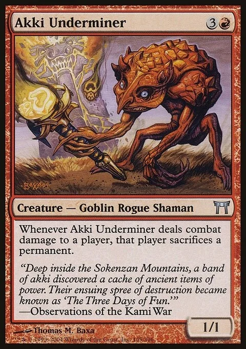 Whenever Akki Underminer deals combat damage to a player, that player sacrifices a permanent.