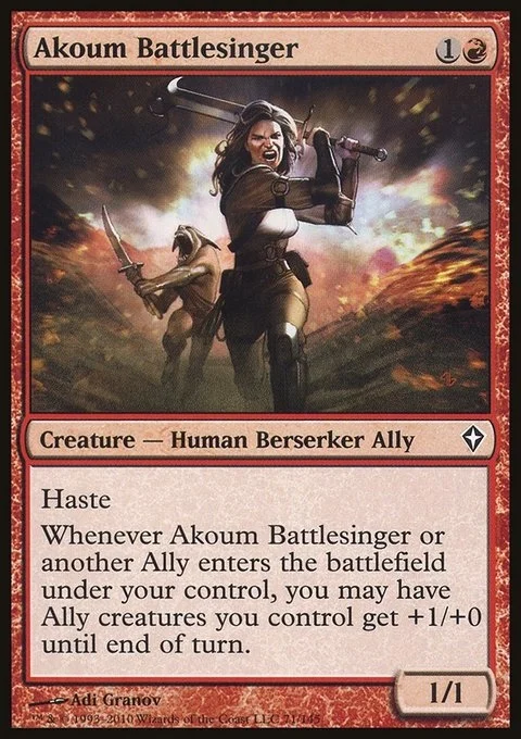 Haste Whenever Akoum Battlesinger or another Ally enters the battlefield under your control, you may have Ally creatures you control get +1/+0 until end of turn.