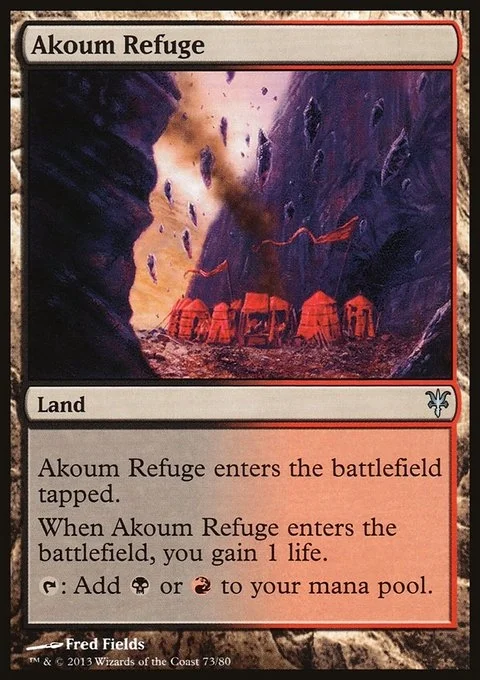 Akoum Refuge enters the battlefield tapped. When Akoum Refuge enters the battlefield, you gain 1 life. {T}: Add {B} or {R}.
