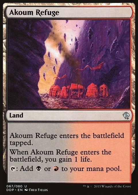 Akoum Refuge enters tapped. When Akoum Refuge enters, you gain 1 life. {T}: Add {B} or {R}.