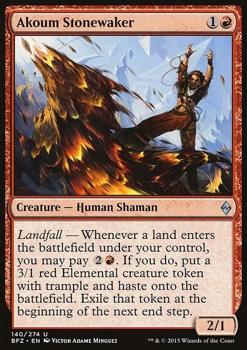 Landfall — Whenever a land enters the battlefield under your control, you may pay {2}{R}. If you do, create a 3/1 red Elemental creature token with trample and haste. Exile that token at the beginning of the next end step.