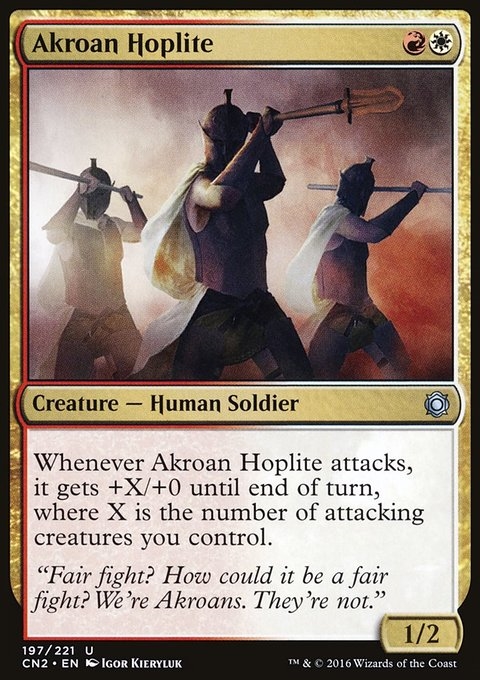 Whenever Akroan Hoplite attacks, it gets +X/+0 until end of turn, where X is the number of attacking creatures you control.
