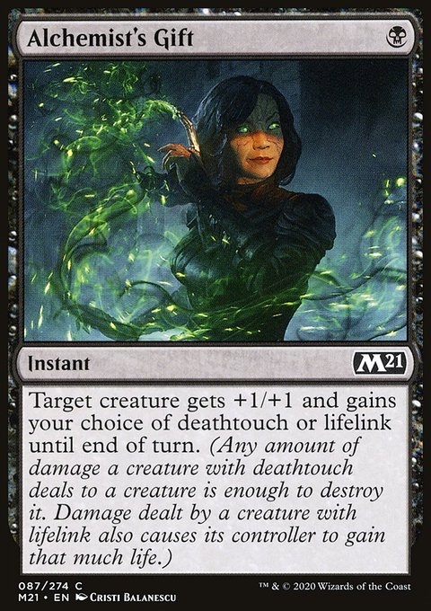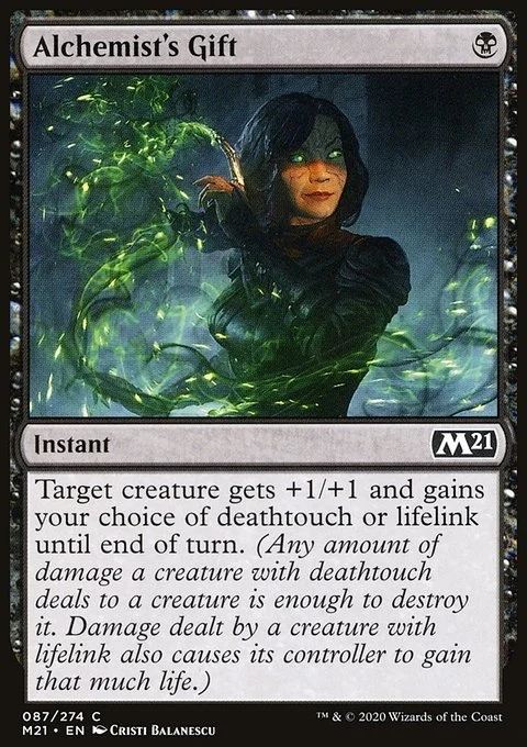 Target creature gets +1/+1 and gains your choice of deathtouch or lifelink until end of turn. (Any amount of damage a creature with deathtouch deals to a creature is enough to destroy it. Damage dealt by a creature with lifelink also causes its controller to gain that much life.)