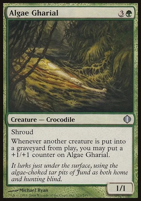 Shroud (This creature can't be the target of spells or abilities.) Whenever another creature dies, you may put a +1/+1 counter on Algae Gharial.