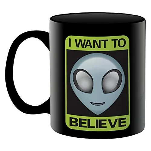This affirming mug might be just the thing that saves your life when the aliens finally land! imagine them rummaging through your house, looking for you and there it is, your alien mug. The 1 thing that will save your life! you're not the enemy! you're a believer! you live! all of this from a modest dishwasher safe coffee mug that holds 11 oz.. Keep the dream alive!!