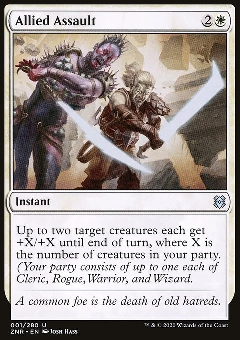 Up to two target creatures each get +X/+X until end of turn, where X is the number of creatures in your party. (Your party consists of up to one each of Cleric, Rogue, Warrior, and Wizard.)