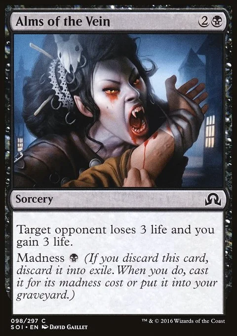 Target opponent loses 3 life and you gain 3 life. Madness {B} (If you discard this card, discard it into exile. When you do, cast it for its madness cost or put it into your graveyard.)