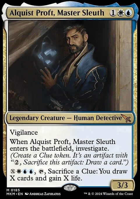 Vigilance When Alquist Proft, Master Sleuth enters the battlefield, investigate. (Create a Clue token. It's an artifact with "{2}, Sacrifice this artifact: Draw a card.") {X}{W}{U}{U}, {T}, Sacrifice a Clue: You draw X cards and gain X life.