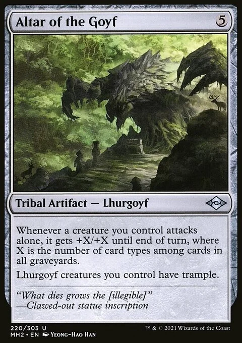 Whenever a creature you control attacks alone, it gets +X/+X until end of turn, where X is the number of card types among cards in all graveyards. Lhurgoyf creatures you control have trample.