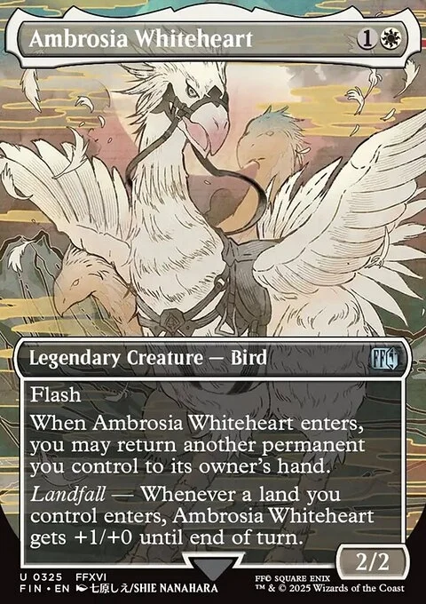 Flash When Ambrosia Whiteheart enters, you may return another permanent you control to its owner's hand. Landfall — Whenever a land you control enters, Ambrosia Whiteheart gets +1/+0 until end of turn.