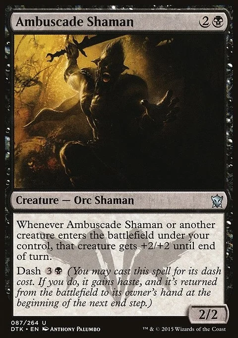 Whenever Ambuscade Shaman or another creature enters the battlefield under your control, that creature gets +2/+2 until end of turn.