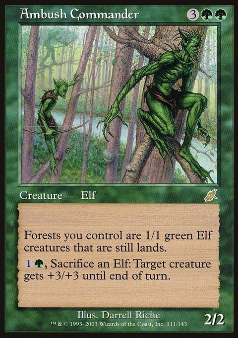 Forests you control are 1/1 green Elf creatures that are still lands. {1}{G}, Sacrifice an Elf: Target creature gets +3/+3 until end of turn.